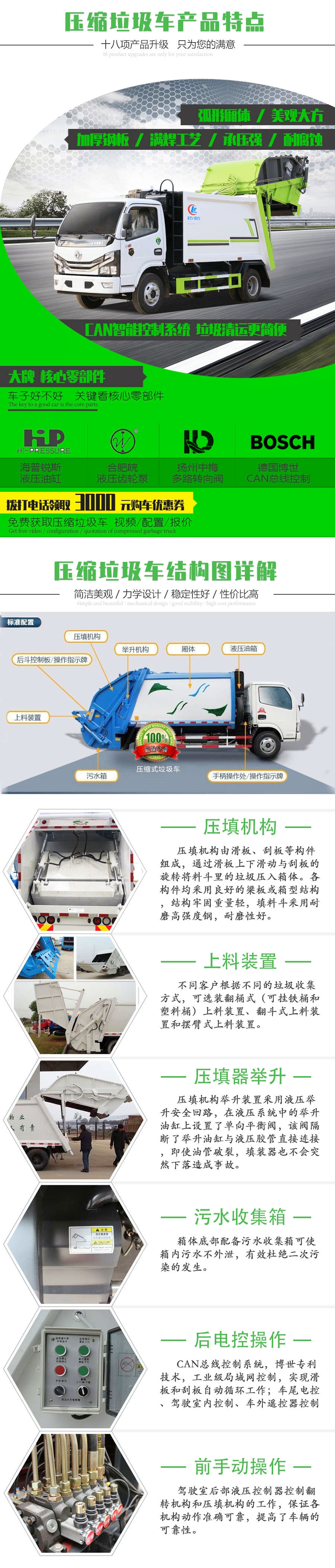 垃圾箱體容積8立方,液壓操作系統為電動(dòng)控制和手動(dòng)控制, 后掛桶翻轉機構, 可掛2個(gè)240L塑料桶、可選裝小三角斗、大落地斗、擺臂裝置等。 合肥皖液齒輪泵, 中梅多路閥, 海普瑞斯油缸, CAN控制系統,背壓閥,污水箱。